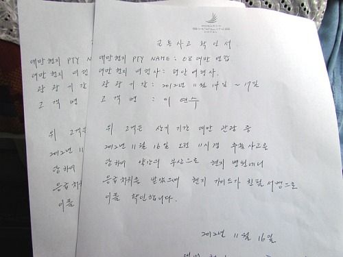 가이드가 친필로 써준 교통사고 확인서