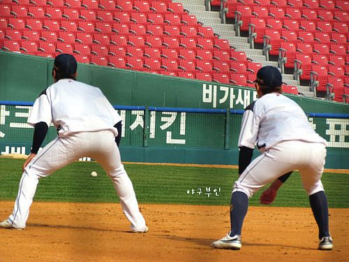야구장에 일찍 도착해서 선수들 연습하는 것을 지켜봤습니다