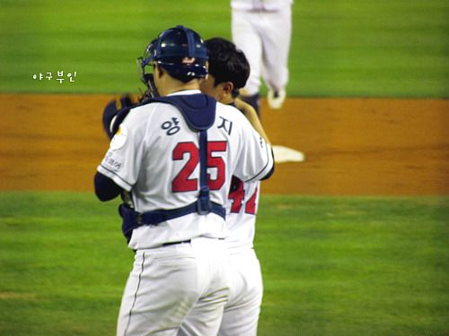 위기를 잘 막아낸 윤명준 선수를 격려하는 양의지 포수
