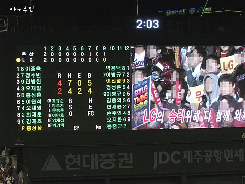 한 후 최준석 선수의 3루수 앞 평범한 땅볼을 정성훈 선수가 더듬는 사이에 홈인..3대 2로