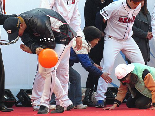 선수와 팬 모두 코끼리 코를 하고 열바퀴 돈 다음에 풍선 터뜨리기