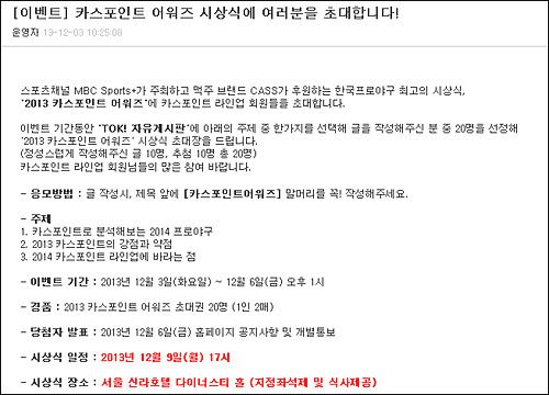 오늘 오후 6시부터 mbc 스포츠 플러스를 통해 생방송으로 진행된 '2013 카스포인트 어워즈'에