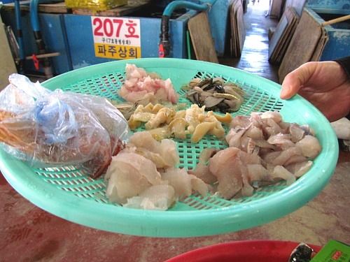생선회 2만원..꽃새우 만 원..새우는 마구 튀어서 봉지에 저렇게 싸놓은 거임