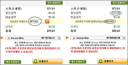 그리고 위에 보시는대로 물건을 다 담은 후 추천인 코드를 넣으면 금액에 따라 할인이 됩니다