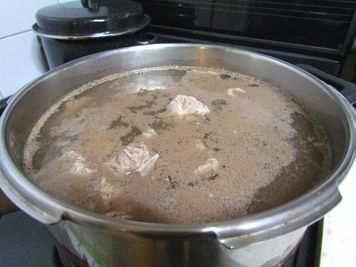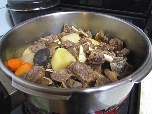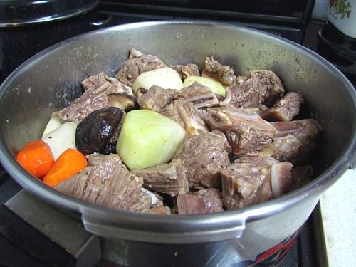 압력솥에 살찍 익힌 갈비와 무와 당근, 표고버섯을 넣고 만들어 놓은 양념장을 끼얹습니다