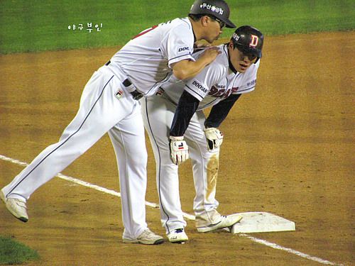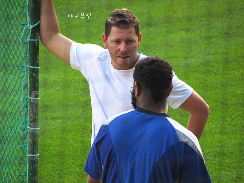 상대팀 코치와 얘기를 나누는 오쟁..공 맞고 나가서 1루심과 얘기를 나누는 브콜돼..ㅋㅋㅋ