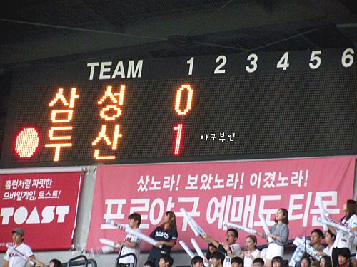 5회 말에 석 점을 추가하며 6대 0으로 앞서가는 베어스
