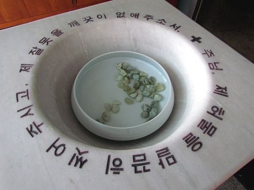 솔뫼성지 안에 있는 작은 성당 앞에 놓인 성수